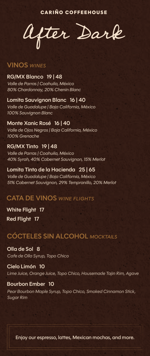 Two nights a week, Cariño shifts into After Dark — a warm, relaxed evening space centered around Mexican wines, handcrafted cocktails, house-made mocktails, signature coffee, and small bites.